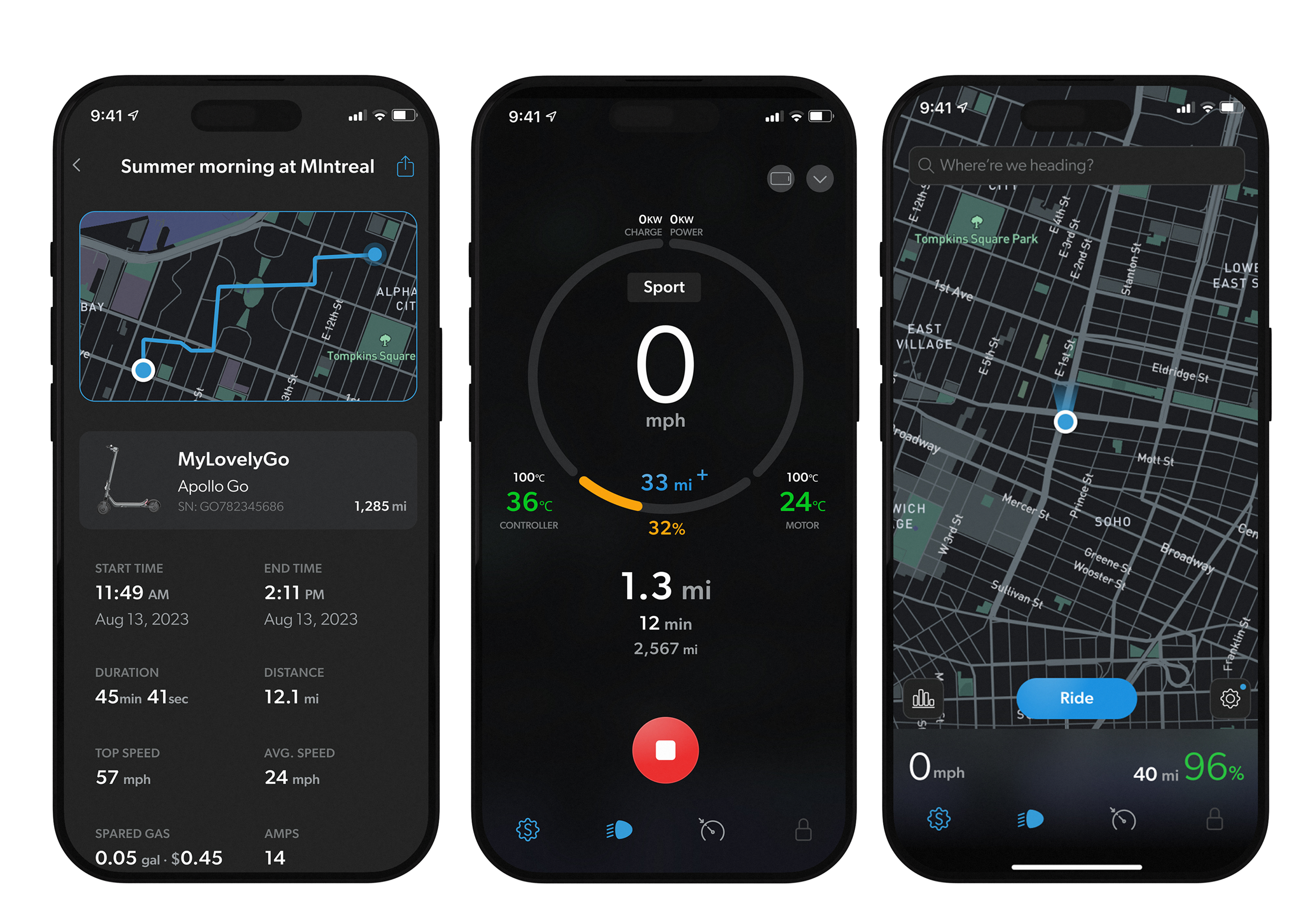The Apollo App puts control of your ride at your fingertips - with free features like real-time stats, ride mode customization, and scooter locking. Unlock smart features: scooter optimized navigation, in-app support from Apollo technicians, and more.